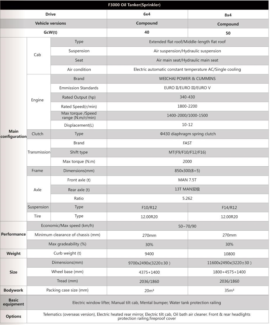 Pokud jde o detaily produktu, motor Shacman F3000 6x4 a 8x4 Truck Truck Truck je různých modelů, s maximální výkonem do 400 hp, vysokým točivým momentem, dobrým výkonem zrychlení a může se přizpůsobit různým pracovním podmínkám. Převodovka je většinou rychlá manuální převodovka, která může realizovat změnu nekonečné rychlosti, rozšířit rozsah točivého momentu hnacího kola a změny rychlosti a zlepšit přizpůsobitelnost nákladního vozidla. Vnitřní čepele nejvyšší nádrže se vytvářejí najednou točením stroj na imitační linii, aby se zvýšila síla a utěsnění; Exteriér kamionu Shacman F3000 6x4 a 8x4 je vystřelen, aby se odstranil napětí svaru a odstranil rez, aby se prodloužila životnost. Truck Shacman F3000 Truck je také vybaven pokročilým zařízením, jako jsou ponorkové ventily, evropské standardní nádržní porty, tyče proti overflow sondy a systémy pro obnovu ropy a plynu, aby byla zajištěna bezpečnost a ochrana životního prostředí během přepravy.